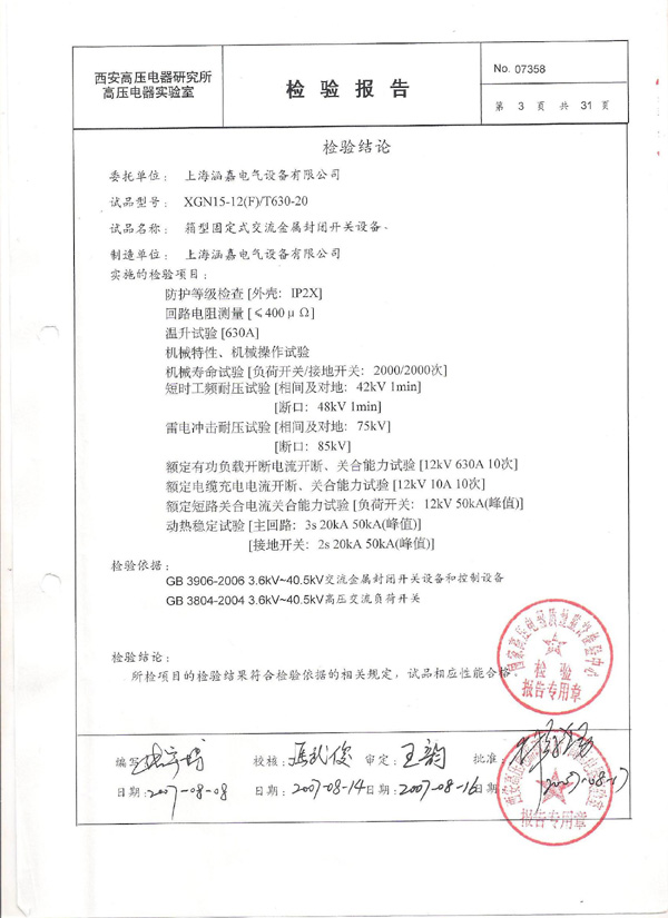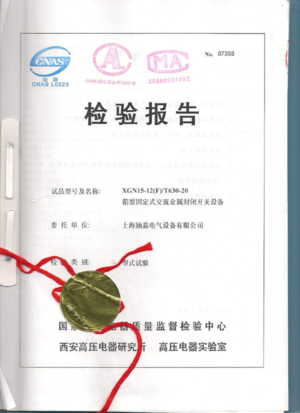 XGN15-12(F)/T630-20箱型固定式交流金属封闭式开关设备检验报告