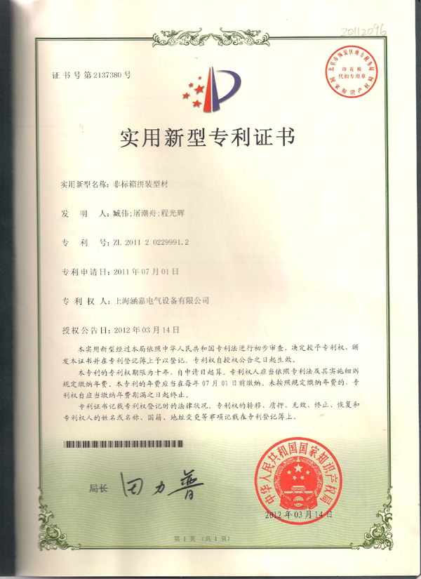 实用新型专利证书:非标箱拼装型材