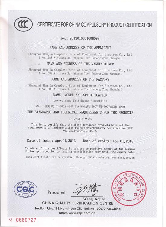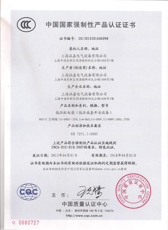 MNS-E低压配电箱CCC认证证书