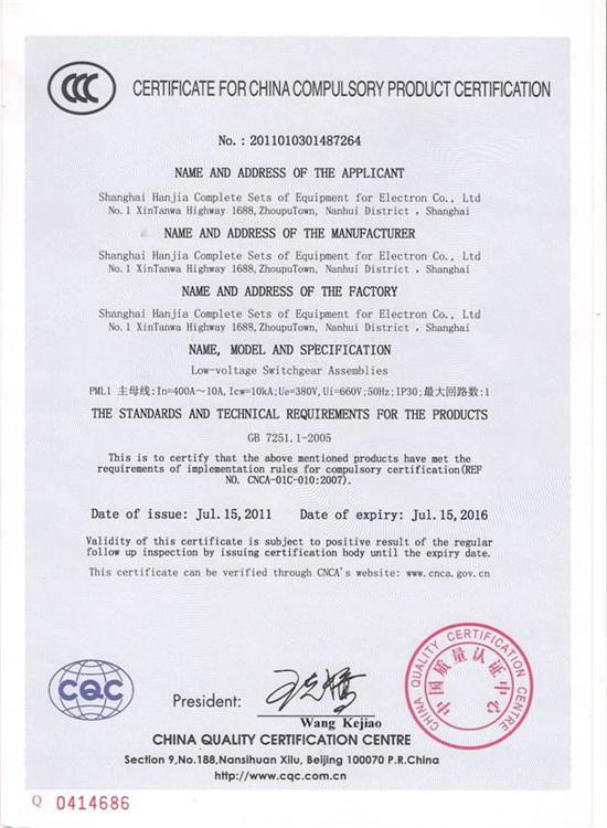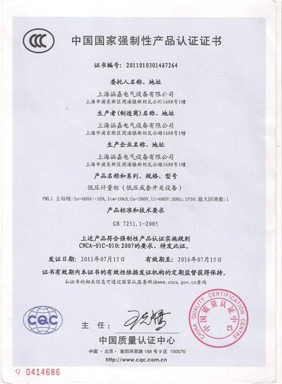 PML1电能计量柜CCC认证证书